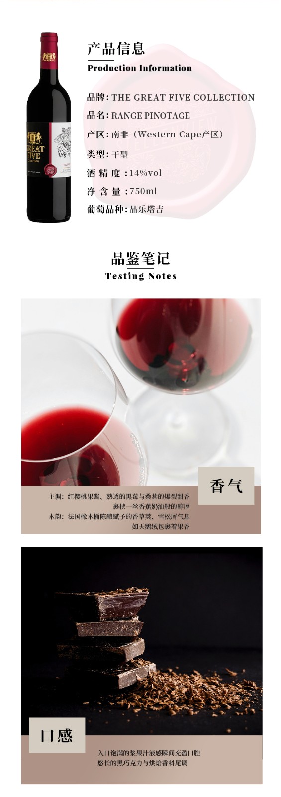 南非进口五蕴珍藏品乐塔吉干红葡萄酒750ml红酒葡萄酒干红庄园聚会